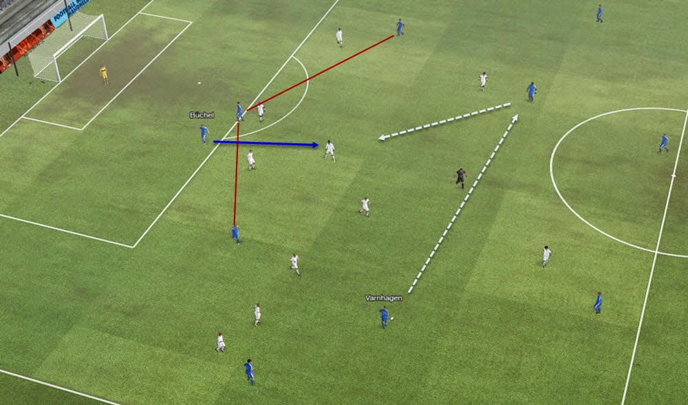 Büchel makes his move, pushing ahead of Micanski and taking up the most advanced position in our line. The ball comes back to Varnhagen (DLP-S) who’ll push it square across the midfield, N’Diaye will waiy for Büchel to come deep once more to receive it in an onside position.